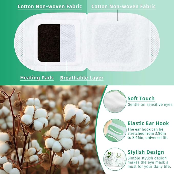 - Self-Heating Eye Mask for Dry Eyes - Warm eye compress reaches a soothing temperature of 104℉-113℉ and last for approximately 30-40 minutes, providing a warm and comfortable feeling around your eyes. Premium cotton non-woven fabric is soft to touch and gentle on sensitive eyes, flexible elastic ear hooks eusure the mask fits any face shape.