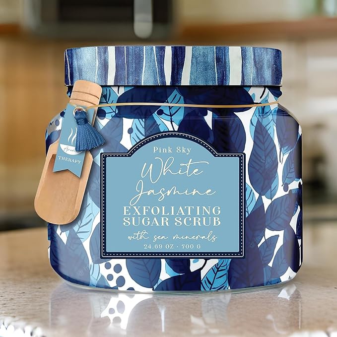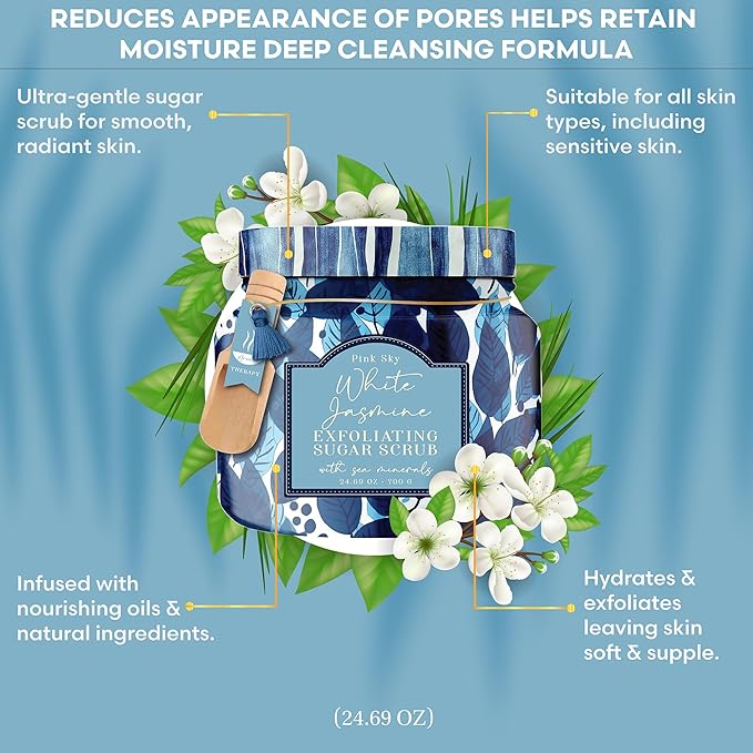 Pink Sky Exfoliating Body Scrub - Ultra Gentle Sugar Scrub for Smooth Skin - Premium Body Scrubs for Radiant, Soft Skin - Ideal Exfoliator for All Skin Types - 700g (White Jasmine, 24.69 Oz)