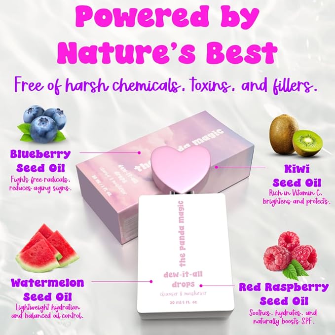 - 🧴Say goodbye to cluttered skincare routines and hello to simplicity with Dew-It-All Drops, your ultimate 2-in-1 solution for radiant, healthy skin! 🥝 Our Dew-It-All Drops are thoughtfully crafted with a luxurious blend of kiwi seed oil, watermelon seed oil, blueberry oil, and red raspberry seed oil, bringing together the power of nature’s superfoods to cleanse and deeply moisturize in one effortless step.