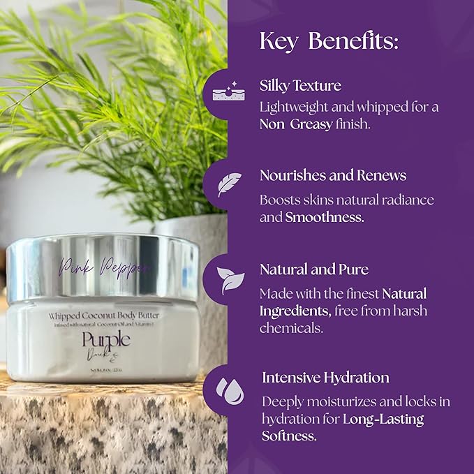 - Experience the luxurious texture of Purple Duck Thick Whipped Coconut Body Butter for Women. Our natural body butter offers a lightweight, non-greasy finish that leaves your skin silky smooth and hydrated.