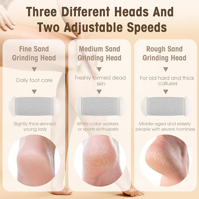 - 【Upgraded 3 Wider Roller Heads 】Different Roller Heads are suitable for the callus of hands, cocked dead skin and more delicate skin care. Fine Roller Head is suitable for the callus of hands, cocked dead skin and more delicate skin care. Regular Roller Head is suitable for the newly formed callus and normal skin care. And Rougher Roller Head is suitable for stubborn thick callus and the dead skin. Wider roller heads help you remove cracked dry dead skin more effectively.
