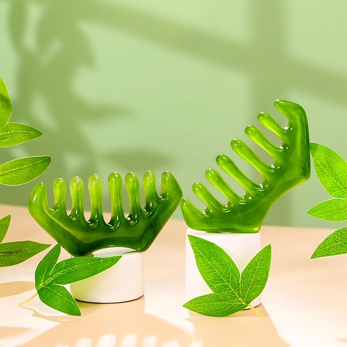 Geiserailie 2 Pieces Jade Combs Massage Stone Hair Gua Sha Scraping Scalp Comb Facial Massage Tool Multifunctional Handheld Head Tools Head Caring Therapy Mother's Day Gift (Dark Green Style)