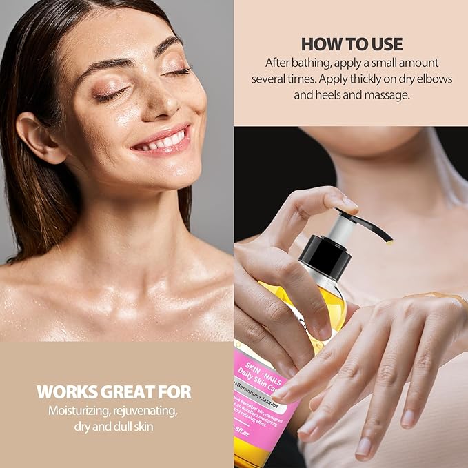 - Rose Body Oil: Enjoy the blend of natural plant oils and essential oils, with Sweet Almond oil, Sunflower Seed oil, Rose, Geranium and Jasmine essential oil to nourish and soften the skin, refine skin texture, making it feel smoother and look more radiant
