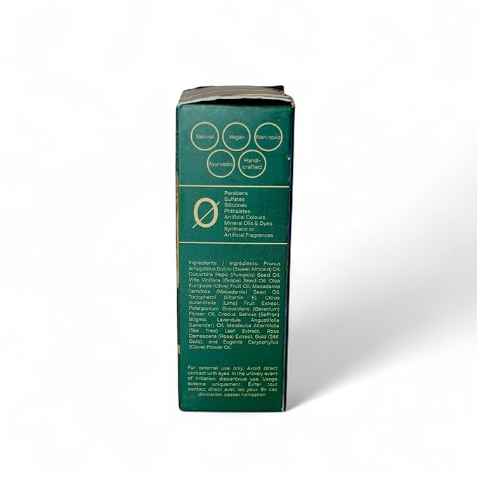 - Special Ingredients : Saffron, 24K Gold, Rose, Lavender, Clove, Macadamia, Olive, Sweet Almond, Pumpkin Seed Oils