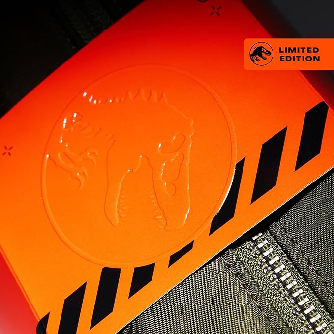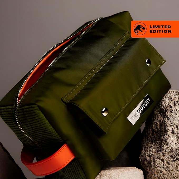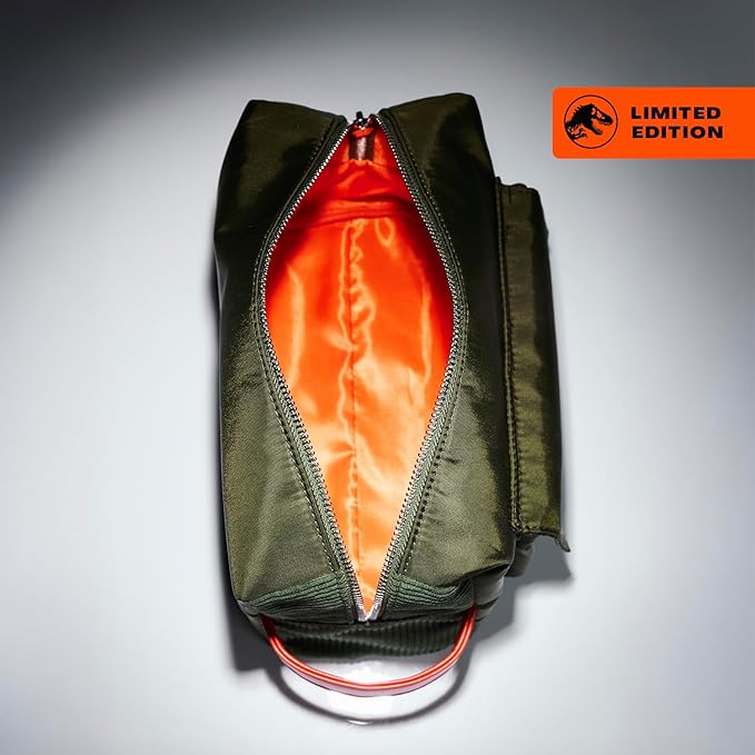 - Crafted in a utilitarian-chic army green with a sleek, easy-to-clean nylon finish, this piece features a vegan leather handle, a spacious front pocket with magnetic closure, silver hardware, and a bold orange lining accented by a tag bearing the iconic Jurassic logo.