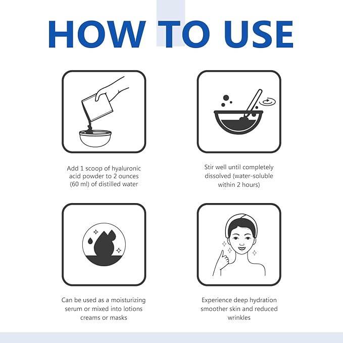 - 【Intensive Moisture & Youthful Glow Formula】Our premium hyaluronic acid powder helps nourish skin with lasting hydration. The unique formulation supports skin's natural moisture retention, promoting a dewy and refreshed appearance. With remarkable water-binding capacity, this innovative formula aids in maintaining skin's supple texture.