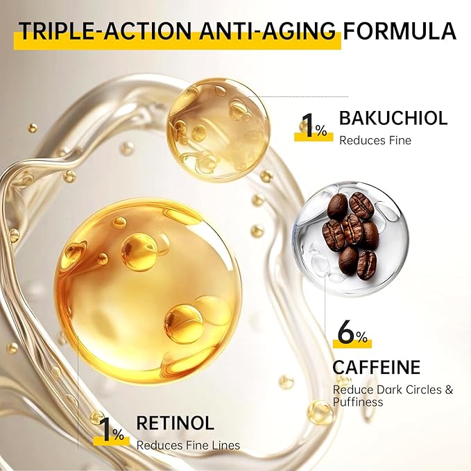 - 【Advanced Formula Eye Cream for Wrinkles】 This powerful solution targets wrinkles, fine lines, dark circles, puffiness, and dryness. Enriched with potent ingredients like 1% Advanced Retinol, 1% Bakuchiol, and 6% Caffeine, it effectively improves the visible signs of aging for a more youthful appearance